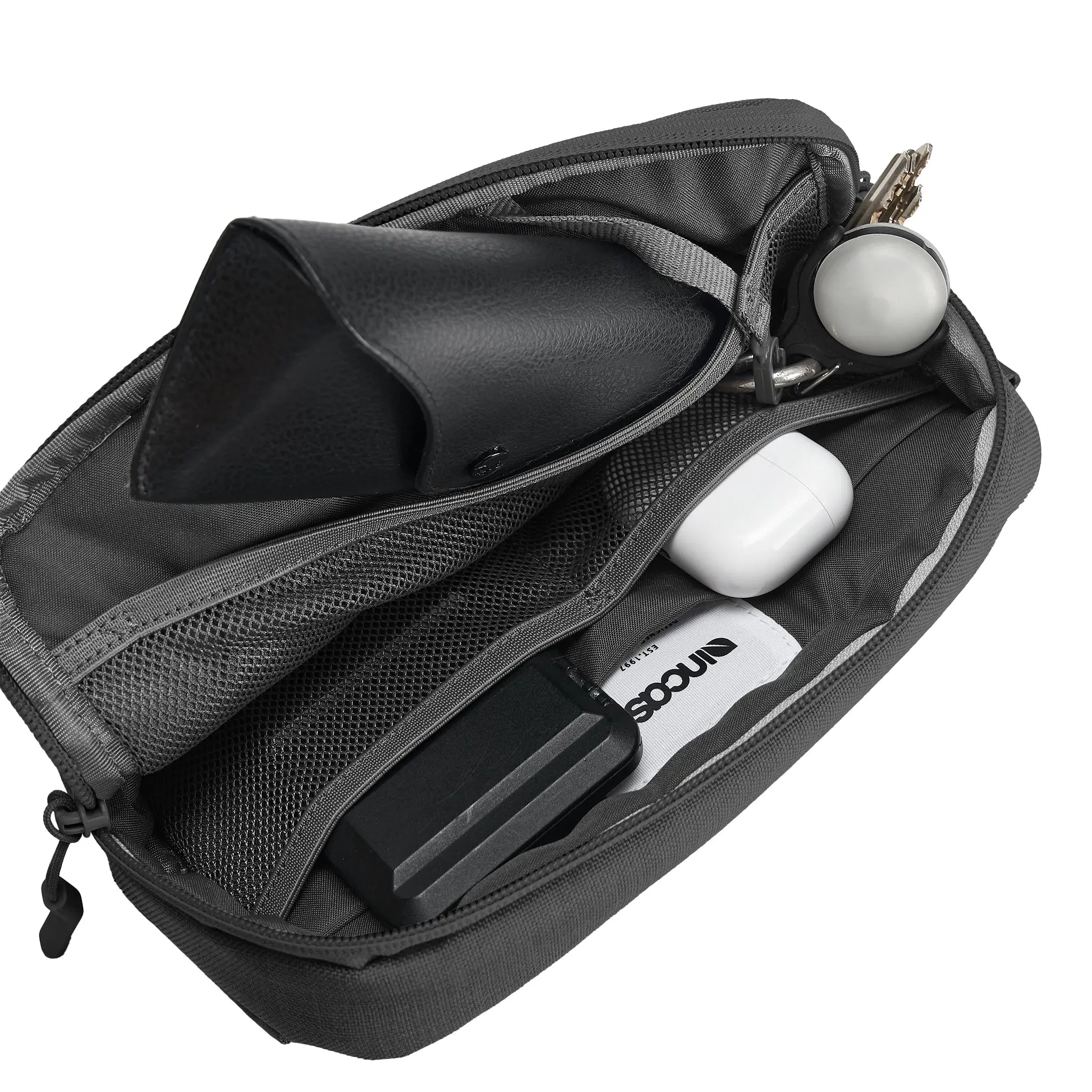 Discreet AirTag storage hidden inside the internal Incase woven label